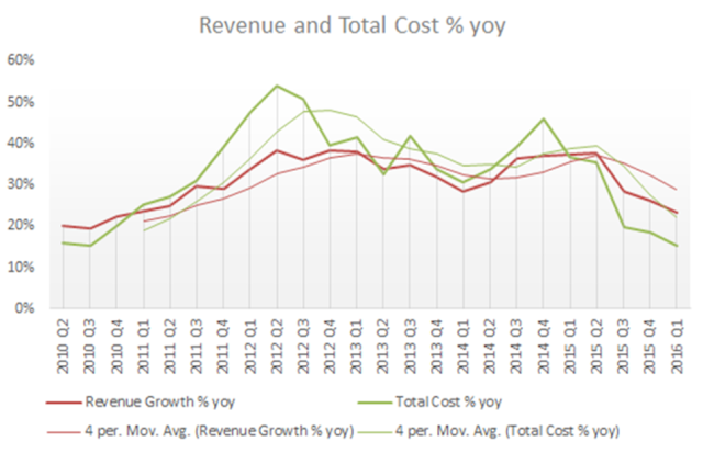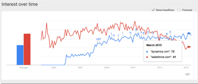 ============== Microsoft Live Writer has finally given up the ghost and will no longer link to Blogger so I am having to use Google's online writing tools until I find another option. All suggestions welcome. Salesforce has done it. The elusive goal of making a profit. Will Marc return to GAAP reporting? Is this a one-off like that tax write-off from a few years ago? Is this the start of a golden era for Salesforce? The numbers will reveal all. Salesforce Quarterly Results The numbers are from Salesforce’s Financials page. These are the numbers reported to the Securities Exchange Commission and are the GAAP numbers, not the non-GAAP numbers we hear in the press releases. 2015 Q1 2015 Q2 2015 Q3 2015 Q4 2016 Q1 Revenue 1,226,772 1,318,551 1,383,655 1,444,608 1,511,167 Subscription Revenue 1,147,306 1,232,587 1,288,513 1,345,358 1,405,287 Revenue Cost 292,305 307,831 333,211 355,923 381,802 Operating Cost 989,808 1,044,154 1,072,486 1,123,501 1,098,260 Salesforce Income -96,911 -61,088 -38,924 -65,765 4,092 Highest Transaction 2,037,819,946 2,502,030,346 2,872,068,400 3,186,923,759 Transaction Growth QoQ 23% 15% 11% Revenue Growth # YoY 334,139 361,457 307,621 299,366 284,395 Revenue Growth % YoY 37% 38% 29% 26% 23% Revenue Growth % QoQ 7% 7% 5% 4% 5% Total Cost % YoY 37% 36% 20% 18% 15% Total Cost % QoQ 3% 5% 4% 5% 0% Staff 14,239 15,145 15,458 16,227 16,852 Staff Growth YoY 38% 20% 21% 22% 18% Margin -7.90% -4.63% -2.81% -4.55% 0.27% Growth Difference 1% 2% 9% 8% 8% Cash 827,891 774,725 846,325 908,117 941,956 Accounts Receivable 684,155 834,323 794,590 1,905,506 926,381 Cash/AR 121% 93% 107% 48% 102% Expenses Relating to Stock Based Awards 131,092 142,411 139,460 151,802 142,560 Stock Based YoY 14% 29% -1% 11% 9% Numbers of Note In terms of what is jumping out at me is a general slowing down in the growth of the business. Transaction growth (the growth in the number of ‘operations’ done on the Salesforce servers) has halved in six months. Revenue growth year-on-year is showing a steady decline over the five quarters above and is the lowest it has been in five years. Thankfully cost growth has also slowed down and, by comparing the revenue year-on-year to the cost year-on-year we see growth is decelerating faster, which is good for profit. Like revenue growth we are seeing a cost growth similar to that of five years ago. Here it is in graphical form. The solid green line (Cost) is running pretty much parallel now with the solid red line (Revenue) with both declining. Cost is also as lot less volatile than the past which is also a good thing. Note that while the lines are parallel, as this is growth, revenues are still growing faster than costs which means we are on a path to profitability. Staff growth is a similar story. A steady deceleration with growth numbers similar to those of the start of 2010. The business growth slowing is good because the aggressive growth strategy was unsustainable and unprofitable. By putting the brakes on, especially on marketing and sales spend, Salesforce has returned to a break-even position. As mentioned, the financials are similar to those of five years ago. Five years ago Salesforce was profitable. Unusual Entries Back in 2013, Salesforce turned a profit because they got a $130m tax rebate. Is this the same again? The only entry which stands out is the once-off “Operating lease termination resulting from purchase of 50 Fremont” which reduced operating expenses by around $37m. As the profit made was $4m this certainly had an impact. It will be interesting to see how the next quarter pans out Cash and Accounts ReceivableAs I predicted last time, Cash and Accounts Receivable have come back in line after the end of year spike to bring in those last-minute contracts. Like our Revenue and Cost measures, the Cash and Accounts Receivable are starting to level out. Earnings Call Buzzword Bingo I was especially interested in this one because we now have a profit to brag about. At 3,500 words this was one of the shorter transcripts in recent quarters. Regardless he managed to utter the phrase “We are all about customer success” twice and his version of bragging about the profit, “Non-GAAP EPS of $0” three times. The words “profit”, “profits” and “profitability” got mentioned once each. Not a huge amount but they are words Marc is unfamiliar with so you can forgive him for not over-working them. Four times his used the phrase “our customer success platform” which is the new branding for the Salesforce stack; the develop platform most dreaded by developers, according to StackOverflow. The rules for Earnings Call Buzzword Bingo are simple. We get the quarterly transcript and count up the words and phrases. Words on the list have had ten or more mentions in the past five periods with the text used being the call transcript after the introduction and up to, but not including, questions. 2015 Q1 2015 Q2 2015 Q3 2015 Q4 2016 Q1 Number of words 2400 4,731 3,922 4,017 3,495 Customers/Customer 22 38 34 23 34 Revenue 19 27 26 25 24 Cloud 15 22 47 32 28 Platform(s) 10 13 27 18 14 Service 13 15 12 5 9 Growth 9 18 16 13 16 Marketing 5 10 8 4 8 Cash 10 11 9 10 11 Operating 11 11 8 20 11 Enterprise(s) 8 10 8 7 8 Dreamforce 11 14 2 1 Analytics 14 11 9 Software 12 4 In terms of words we have lost, unfortunately ExactTarget and Salesforce1 are no longer the golden children they once were and we lose them from the list. No new words stood out other than ‘incredible’ (ten times), ‘world’ (17 times), and ‘success’ (12 times). These are a bit generic though so I am not adding them on. Google Trends Our quarterly review of Google searches for “Dynamics CRM” and “salesforce.com”. People are still more interested in Googling about Dynamics CRM. In terms of regional interest, nothing really has changed in terms of the countries looking at the two terms but the cities is interesting. Firstly, let us look at “salesforce.com”: Clearly 