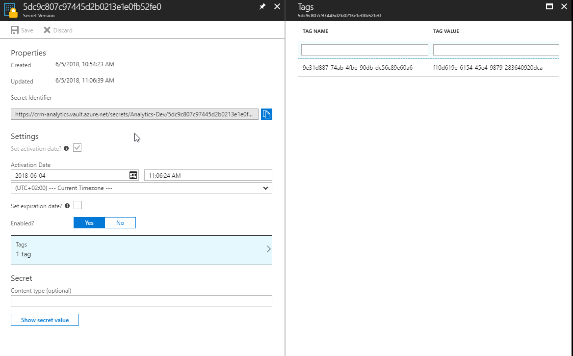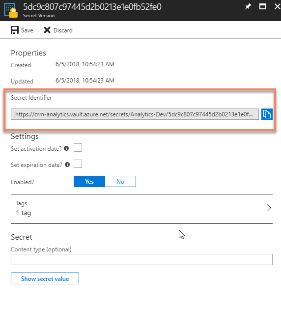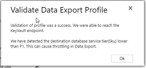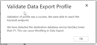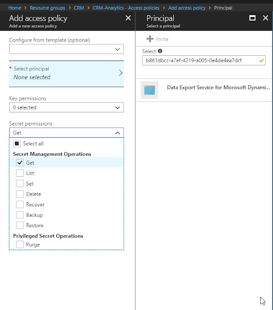 ============== Setting up Dynamics 365 Data Export Service requires a Azure KeyVault to be set up which is typically done using a PowerShell script which can be found in the Data Export Service setup wizard. However, if you run into issues setting this up, it might be easier to do this directly in Azure by minimizing the steps of the scripts. This was a tip that my friend and Business Solution MVP Scott Durow recommended. He mentions this in his very instructive video, but doesn't actually show how, so I thought I'd just detail how I made it work. First some background. The reason why I even started investigating how to do this manually was that when I tried running the PowerShell script supplied by Microsoft in the wizard. ![]() First step is to make sure you have all your data straight. The power shell script is good for this. Check out Scott clip if you want to know how to find the different strings. He shows it very clearly. Just copied from the PS-Script: $subscriptionId = '' $keyvaultName = 'MyVault' $secretName = 'MySecretName' $location = 'North Europe' $connectionString = 'Server=tcp:,1433;Initial Catalog=;Persist Security Info=False;User ID={your_username};Password={your_password};MultipleActiveResultSets=False;Encrypt=True;TrustServerCertificate=False;Connection Timeout=30;'$organizationIdList = '' $tenantId = '' The highlighted parts have to be replaced by your settings. I will use these variables to have something to reference to further in this article. ![]() Then we have to set it up. Not so tricky if you have worked with Azure before. Consider if you want to work in an existing Resourcegroup or if you want to create a new one. Typically you need to have Azure SQL services running as well so it might be good to keep them all together to be able to see the costs and control who has access why a resource group might be a good idea. But that should hence already exist. If not, you can create it. I would recommend keeping Azure SQL and Key vault in the same, not sure if it actually works in different resource groups, probably does, but I haven't tested. ![]() Now we need to open the Key vault and select the "Secrets" section in the menu on the left hand side and press the button: "+ Generate/Import" Then you have to enter you Secret name ($secretName) and the connection string ($connectionString) into the value. ![]() Press "Create". You should now return to the previous screen and see a row for your secret. Select it. It should open the settings panel for the Secret, press the "Tags" part which is located in the middle and add a tag which has $OrgIdList ($organizationIdList) as the key and Tennant ($tenantId) as value. I have blurred them out below as they are rather private. ![]() You then need to go back to the Key Vault and click on the "Access Policies" menu item, you should then see yourself as the principal as this was set when we created the key vault. We now need to add Data Export Service as a valid Principal with read access rights. So click "Add", click "Select Principal" and search for "b861dbcc-a7ef-4219-a005-0e4de4ea7dcf" which is the ID for Data Export Service. It should show up like this: It needs to have "Secret Management Operations - GET" permissions and nothing else. Now, go back to the Secret and copy the URI to the Secret. ![]() Fill in the other information and press validate. Hopefully it will work out well! Some issues Being too cheap with the Azure SQL level If you don't go for a Azure SQL P1 and choose a lower tier, you might get this warning: We tried an S0 for our Dev environment and tried to sync a couple of million records and that just didn't work, we got tons of errors. We upgraded the ASQL to S2 and then at least we didn't get any errors. We are planning for P1s in UAT and production. Might have to set activation date on secret Seems that you might have to set an activation date on the secret. Not sure why this is, the PS-script doesn't seem to do this. But not very hard. ![]() Using Database schema that is not created The default database schema is "dbo" in the Data Export Service Wizard. If you change this to something else like "crm" and you haven't created this in the database, you will get an error. It is simple to fix, you just have to go into the database and create the schema. To create the schema "crm" open a query and run: CREATE SCHEMA crm For more information on how to create schemas, check this site: https://docs.microsoft.com/en-us/sql...ql-server-2017 Once the schema has been created, there should be no problem using it, as long as the user has permissions using it. I hope this works for you. If you have any questions, don't hesitate to leave a comment. Gustaf Westerlund MVP, Founder and Principal Consultant at CRM-konsulterna AB www.crmkonsulterna.se Источник: http://gustafwesterlund.blogspot.com...e-without.html