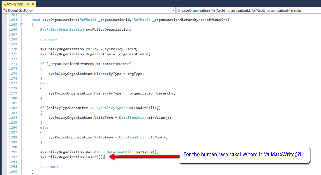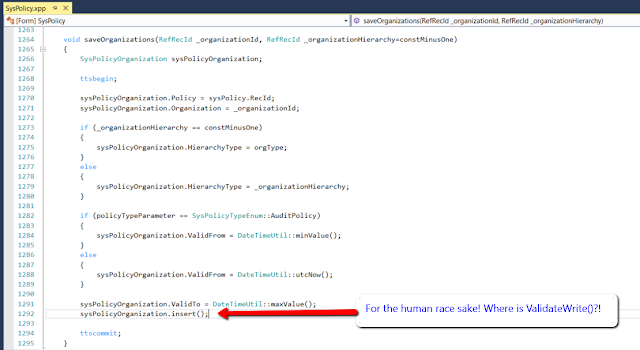 Я для такого обычно использую следующий метод X++: public static void validateWriteRecordCheck(Common _record) { if (! _record.validateWrite()) { throw error(strFmt("Failed to write %1 table", tableId2pname(_record.TableId))); } } ![]()