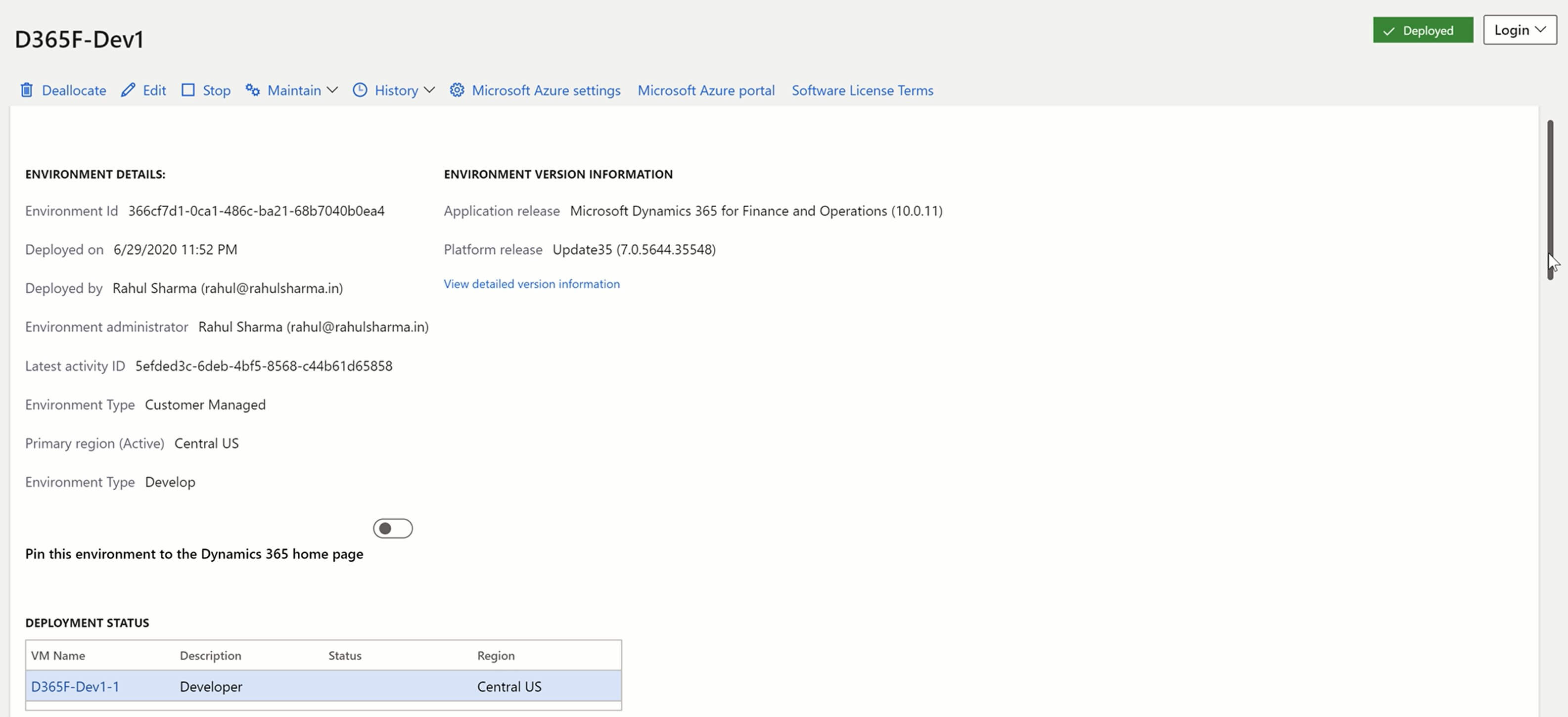 Once the deployment is complete, you can click on the environment tile and it will take you to the Environment Details page. Environment details page contains all the necessary information, to access or maintain the environment.